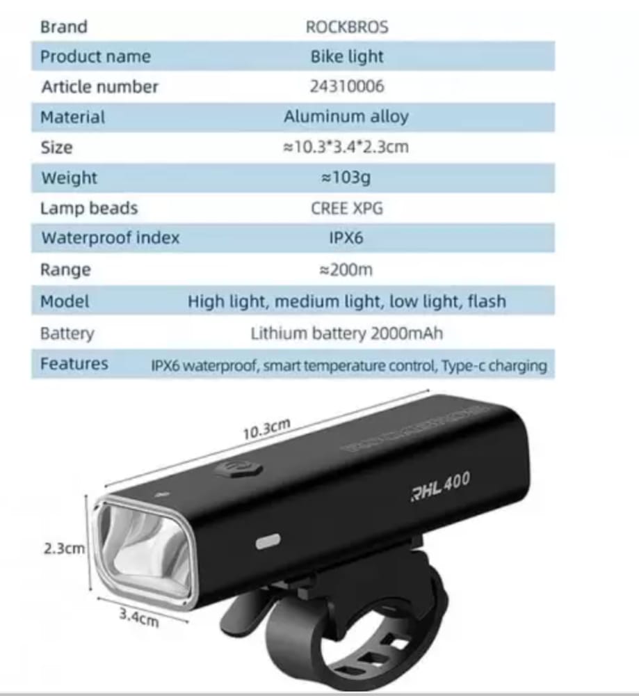 -Material: Aleación de Aluminio. -Lúmenes: 400 - Peso: 103g -Modo: 4 modos alto/Medio/bajo/Intermitente -Resistente al agua IPX6: resistente al agua para uso diario -Alcance: aproximadamente 150 metros -Tiempo de carga: alrededor de 2.5-3 horas -Tiempo de USO: entre de 7 a 11 hrs. -Cargador USB tipo C.