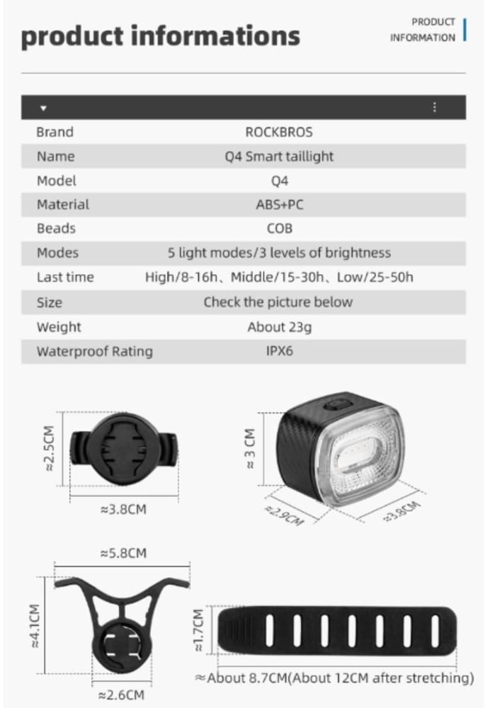 -Sensor de freno -100 lúmenes -2 bases incluidas: al sillín y al poste -4 modos de uso -Duración de batería de 7 a 16 horas -Tiempo de carga 2 horas -Ultra brillante -4 modos de uso y 3 colores -Recargable vía Usb -Resistente al agua IPX6