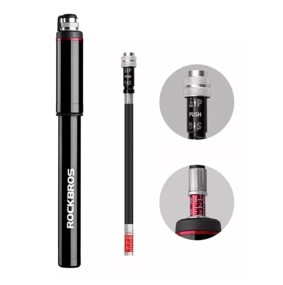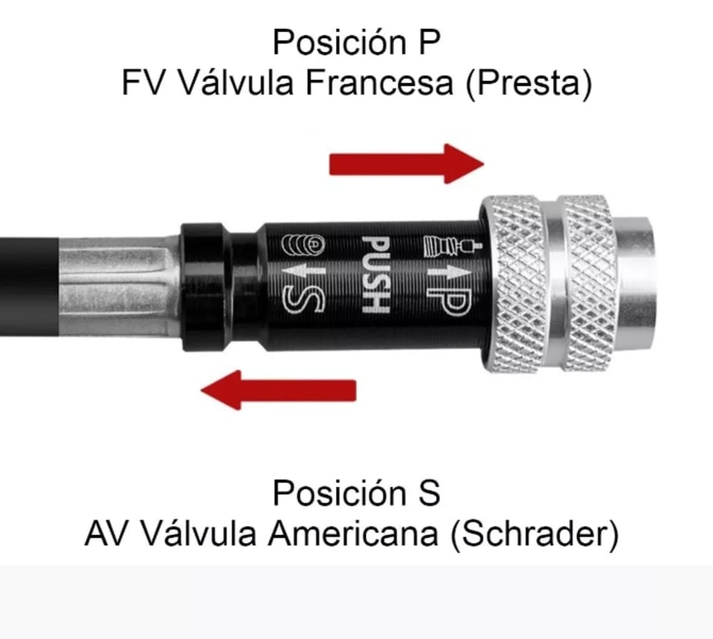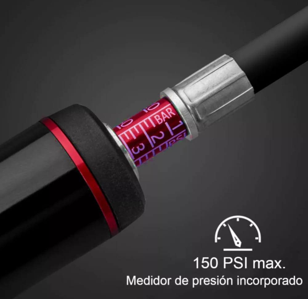 -Material: Cuerpo de aleación de aluminio, manguera de goma. -Tipo de válvula: AV Válvula americana (autos) convertible FV válvula francesa. Incluye 2 adaptadores extra, válvula aguja y adaptador boquilla inflables -Tamaño: Longitud del bombín 21,5 cm aprox. (39cm aprox. al estirar + 10 cm aprox. de manguera) -Peso: 132g aprox. -Color: Negro. -Presión de aire: Máximo 150 PSI.